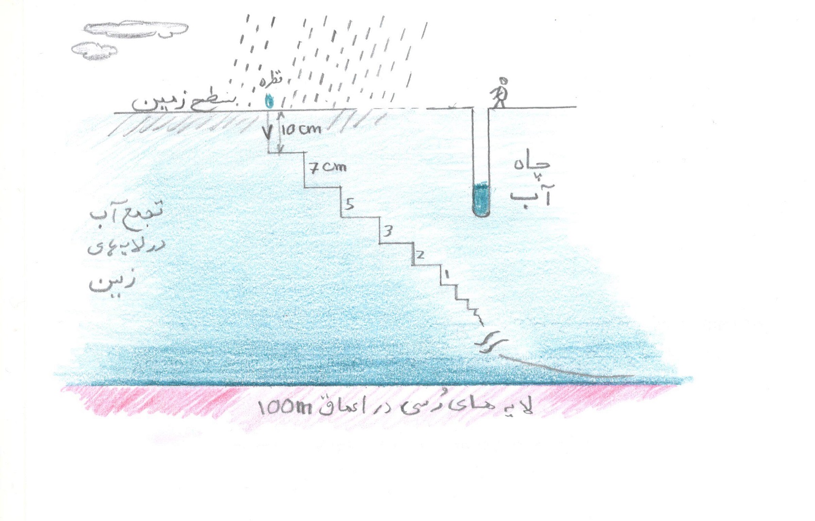 پس اجمالاً نحوه نفوذ قطرات آب بی شباهت به پلکانی نیست که ارتفاع پله ها مرتباً مطابق آنچه در شکل دیده میشود کاهش مییابد. این نفوذ آب، اگر باران همچنان ببارد، راهی اعماق خاک میشود تا آنجا که زمانی به لایه های رُسی نفوذ ناپذیر برسد مثلاً در عمق 100 متر یا بیشتر. از این زمان به بعد حالت "شبه پایدار" برقرار میشود و به ازای هر قطره باران بر سطح زمین، یک قطره در عمق 100 متری پدیدار میشود توگویی خود را فوراً بآنجا رسانده باشد! کم کم سفره های اعماق زمین موسوم به آبخوان ها از آب اشباع شده مدتی صدها هزار بلکه میلیونها سال زمان میبرد! بنابراین هر یک لیتر آب که از آبخوان بر میداریم، اگر بخواهیم حساب سپرده ما پایدار بماند، باید یک لیتر آب از آسمان بر زمین ریخته وارد آن شده باشد. همانطور که تشریح شد رسیدن این آب به آبخوان هزاران و بلکه میلیونها سال بدرازا میکشد ولی ما تصور میکنیم فوری است. مادام که آهنگ برداشت آب با میزان نزولات برابر باشد محتوای آبِ سفره های زیرزمینی نسبتاً پایدار میماند (1404/5/6). والا آن میشود که در 47 سال اخیر شد و با ادعای پوچ "هرکه دندان دهد نان دهد" با حفر چاه های بی حساب سفره های آب زیرزمینی تخلیه شد! این حقایق را مردم عادی متوجه نیستند و آنها که عمق این فاجعه را درک و فهم کرده اند یا در تبعید یا در زندان یا پناهنده به خارج و یا زیر زمین خفته اند اگر روشنگری کرده باشند.